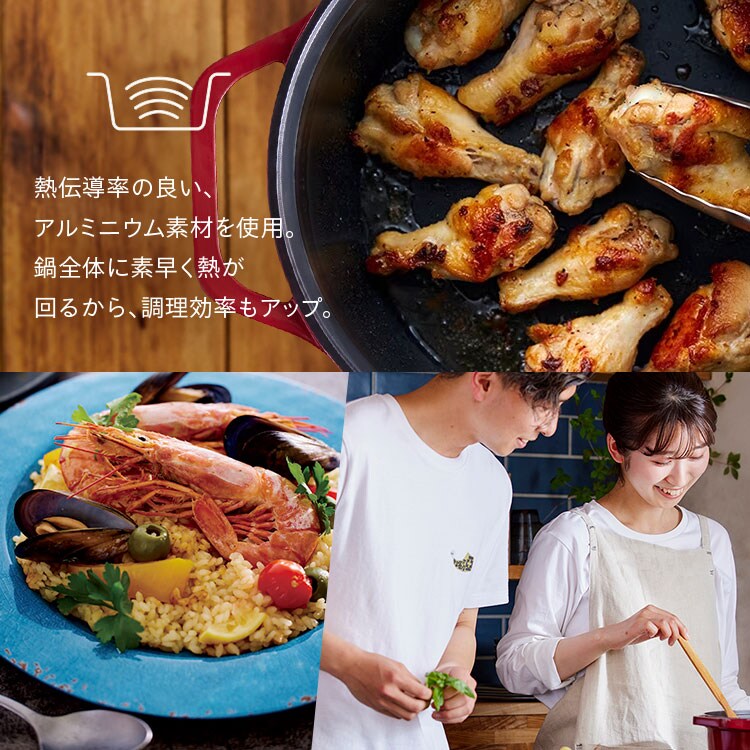[POINT]熱伝導率の良い、アルミニウム素材を使用。鍋全体に素早く熱が回るから、調理効率もアップ。