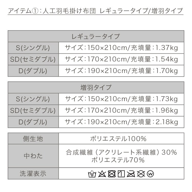 ・本製品は羽毛を模した形状のわたを使用しています。その為通常のわたを用いた布団に比べ、洗濯の際にわたが片寄る場合がありますので、以下の点[※1、2]にご注意ください。